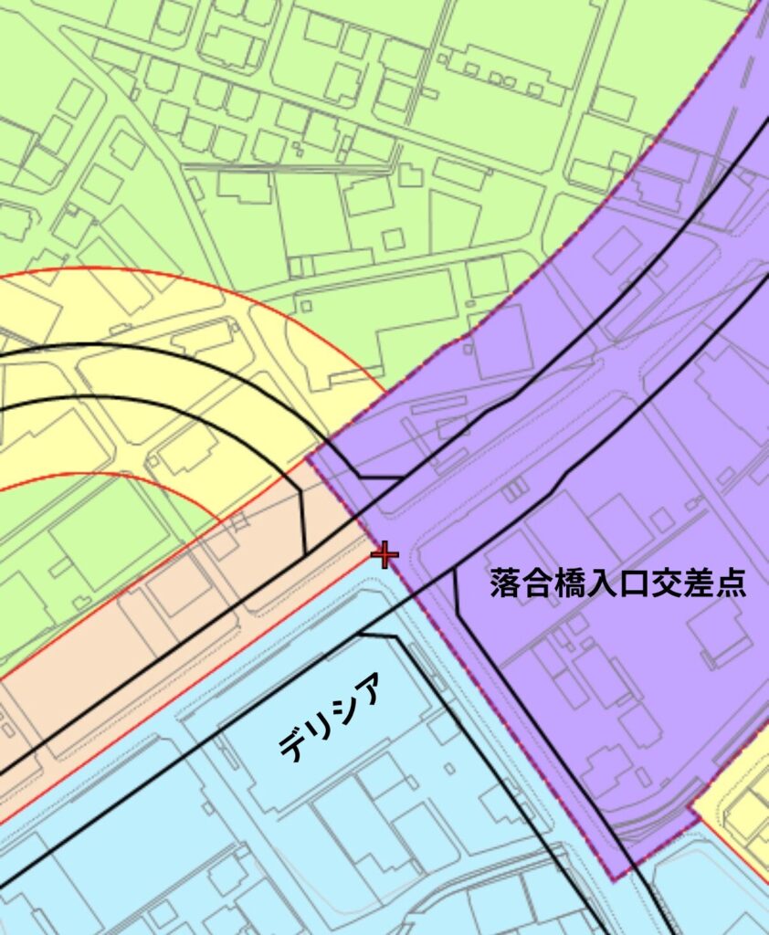 都市計画図を確認すると、黒い線が拡張後の道路幅となります。建物に拡張予定の道路がかすかに被っていることが分かります。